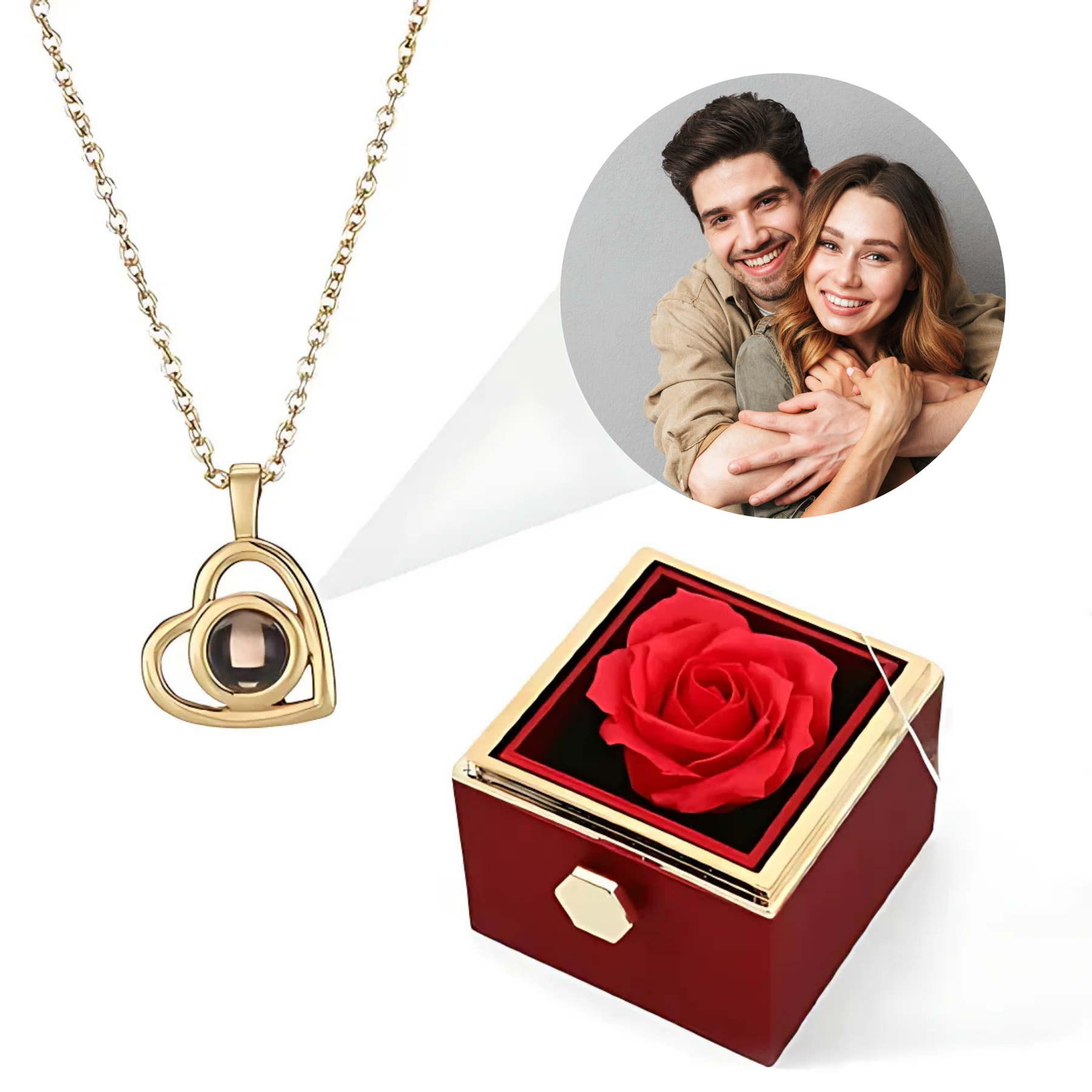 Eternal Rose Box - With Heart Photo Projection Necklace and Real Rose