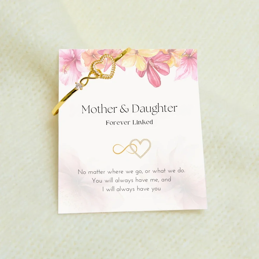 This elegant bracelet is more than just a piece of jewelry — it’s a daily reminder of the unbreakable bond between mother and daughter. With a heartfelt message card and a timeless heart-and-infinity symbol, it’s the perfect gift to show her that you’ll always be by her side — no matter where life takes you both.